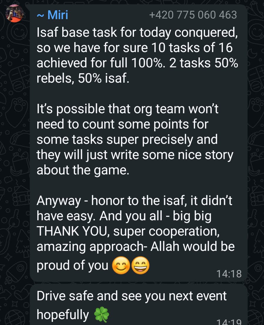 Aufgrund der Respawn-Regel (3 Stunden) und der verbleibenden Zeit wurde der Einsatz nach der Rückkehr nach Kandahar beendet.